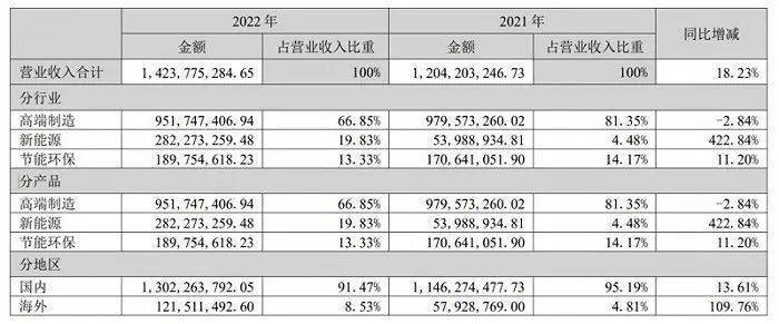 近年来,合康新能的高端制造业务收入占比均保持在第一位,是营业收入的最大来源,不过出现占比下降的迹象。2021年和2022年合康新能的高端制造业务收入分别是9.80亿元和9.52亿元,占据营业收入的比重分别为81.35%和66.85%,不管是收入金额还是比重,2022年度均呈现下滑。