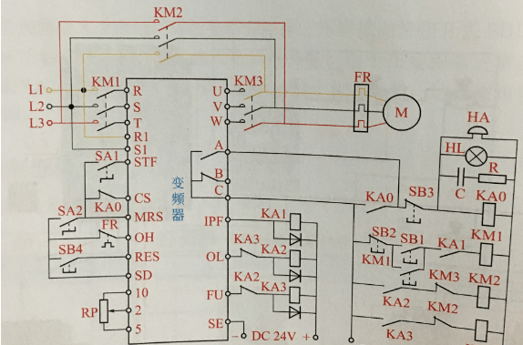 当变频器工作中反常,反常输出端子A、C接通,中心继电器KA0线常开触点闭合,振铃HA和报警灯HL得电,宣布声光报警,与此一同,IPF、FU端子变为高电平,OL端子变为低电平,KA1、KA3线线主触点断开——变频器与电源——电动机断开。KA2线线主触点闭合——工频电源直接提供给电动机(注明:KA1、KA3线线圈得电并不是一同进行的,有必定的切换时刻,它与Pr.136、Pr137设置有关)。
